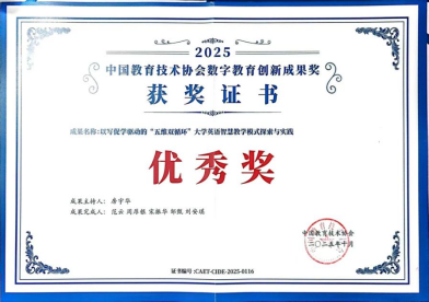 近日,中国教育技术协会公布了2025年数字教育创新成果奖评选结果,武汉晴川学院外国语学院大学英语教研室房宇华、范云、周厚银、宋振华、邹甄、刘安琪联合申报的《以写促学驱动的“五维双循环”大学英语智慧教学模式探索与实践》教学成果荣获优秀奖。